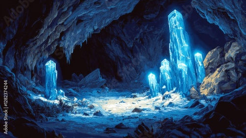 Mystical Blue Crystal Cave with Glowing Formations and Pixel Art Style