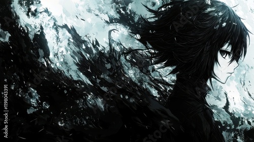 Mystical Character in Dark Environment Surrounded by Whimsical Black Swirls and Abstract Shapes Representing Emotion and Depth in Stylized Art