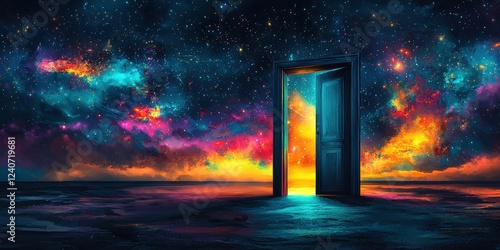 Mystical Doorway Glowing Against Cosmic Night Sky