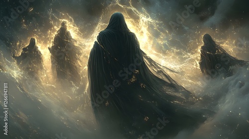 Mystical Figures in Glowing Celestial Sea Dark Hooded Cloaks Fantasy Art Digital Painting