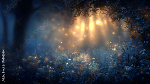 Mystical forest at dawn with golden sunlight streaming through trees, illuminating wildflowers and fireflies in a magical glow.