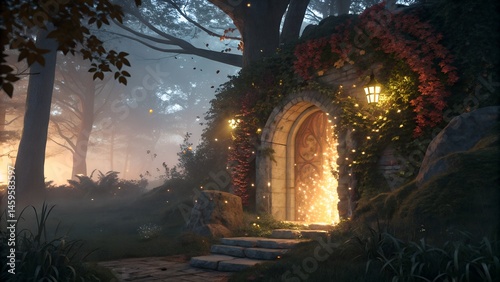 Mystical Forest Doorway with Enchanted Light and Stone Arch