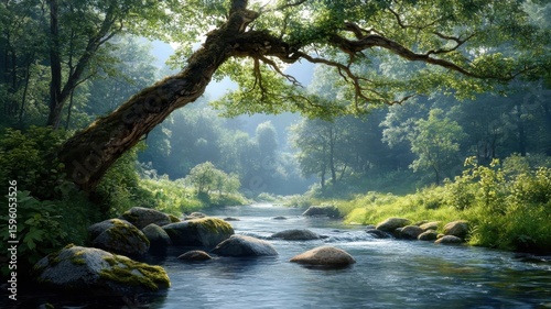 Mystical forest stream flowing over smooth stones, surrounded by towering trees.