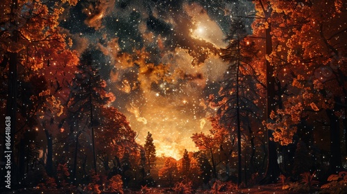 Mystical Forest with Glowing Lights and a Starry Night Sky. Abstract surreal landscape of fantasy and dreams.