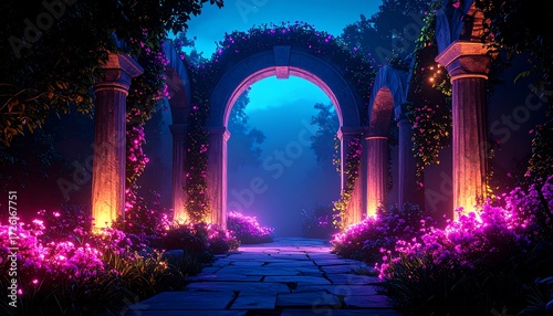 Mystical Garden Path Illuminated with Glowing Flowers and Arches