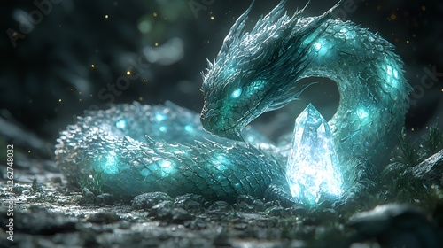 Mystical serpent guarding crystal