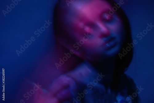 Mystical young dark haired woman in violet light