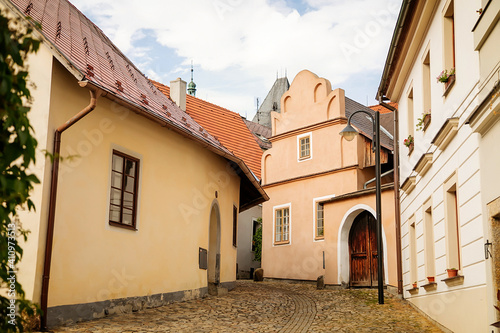 Narrow medieval picturesque street with baroque and renaissance historical buildings in sunny summer day, beautiful cityscape of medieval town, Tabor, South Bohemia, Czech Republic