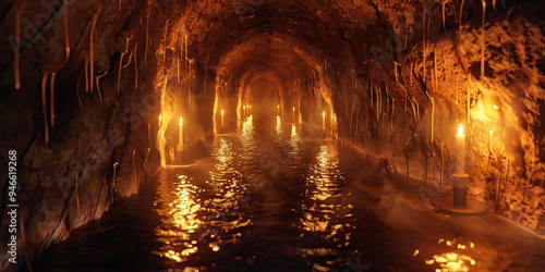 Narrow Passage: A claustrophobic tunnel leading to a hidden crypt, its walls illuminated by flickering candles and dripping with moisture.