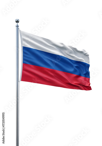 National flag of Russia on a pole waving in the wind, Russian tricolor symbol with white, blue, and red horizontal stripes, isolated on white background