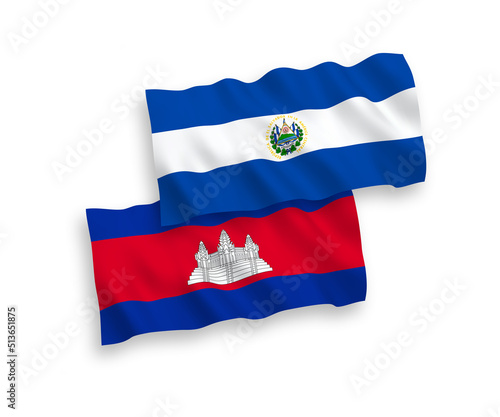 National vector fabric wave flags of Kingdom of Cambodia and Republic of El Salvador isolated on white background. 1 to 2 proportion.