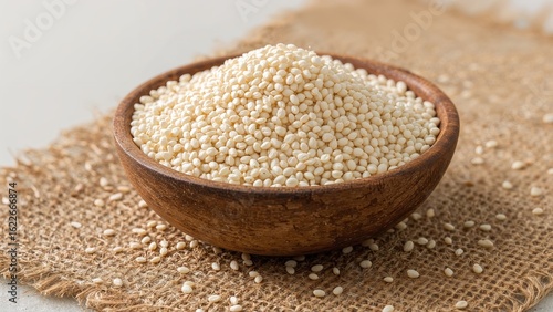 Natural burlap backdrop showcasing wooden bowl packed with Adlay millet