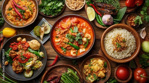 Natural food (various cuisines) Different food cooked on a wooden table Food backgrounds: table filled with large variety of food
