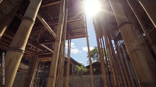 Natural Light Streaming Through a Bamboo Structure with Blue Sky and Greenery, Capturing the Intersection of Nature and Modern Architecture