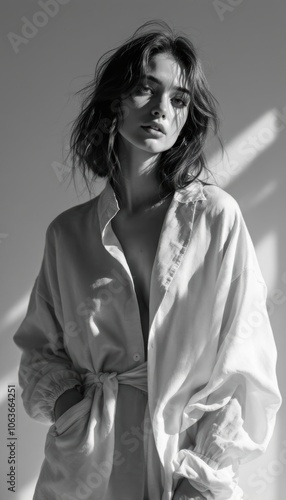 Natural Portrait of Woman in Loose Shirt with Soft Lighting