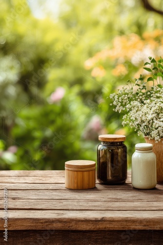Natural skincare products in glass jars and wooden packaging resting on a rustic table outdoors with soft green foliage background
