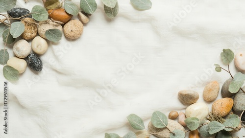 Natural spa composition with rounded stones, eucalyptus branches and soft white towel, wellness, purity and relaxation feel.