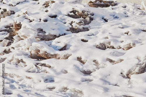 Natural texture of melting snow and ice in spring. The loose structure of snow is covered with a new fresh layer after a snowfall. Sunny day.
