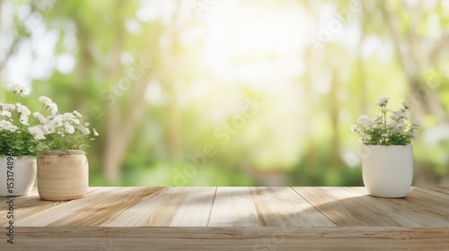 natural wooden counter top with soft shadows and blurred sunny garden scene, clean center area for text or product placement, white flower pots on both sides