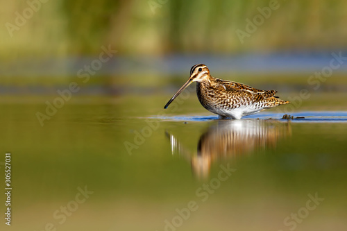Nature and bird. Green yellow nature background. Bird: Common Snipe. Gallinago gallinago.