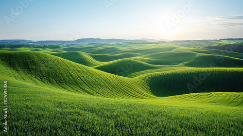 Nature background featuring rolling hills covered in soft green grass under a clear sky
