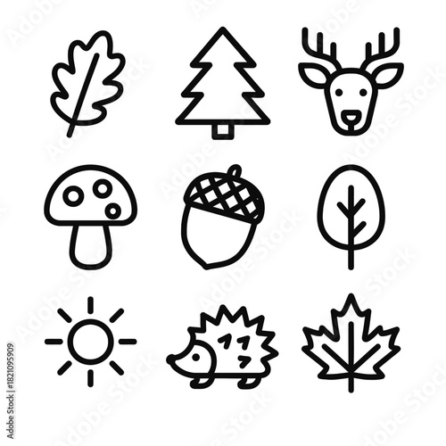 Nature icon set: leaf, tree, deer, mushroom, acorn, sun, hedgehog