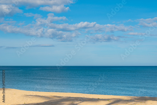 Nature of the ocean and blue sky Summer with sunshine, sandy beaches, clear blue waters sparkling against the blue sky. on an island with good ecology and environment Background for summer vacation