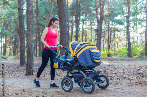 Nature walk with stroller, young active mother in sportswear walking on the forest walkway with her baby in the pram, enjoying fresh air