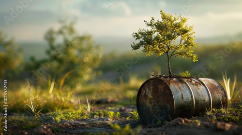 Nature's Triumph Resilient Tree Emerging from Abandoned Oil Drum