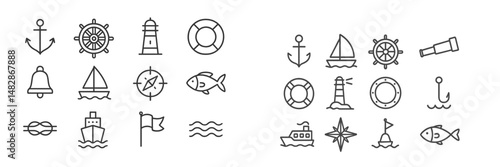 Nautical themed line drawings including boats, anchors, lighthouses, and sea creatures in a minimalist style suitable for marine design projects