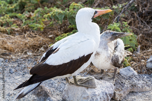 Nazca booby with young (Sula granti) Genovesa Island, Galapagos Islands, Ecuador