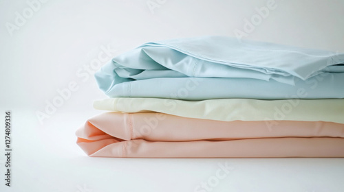Neatly folded clean bed sheets stack for home interior and laundry organization
