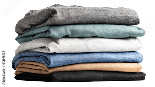 Neatly folded, freshly washed and ironed colorful clothes stack, assorted garments isolated on white, high-resolution PNG-style cutout with transparent background feel for apparel mockups