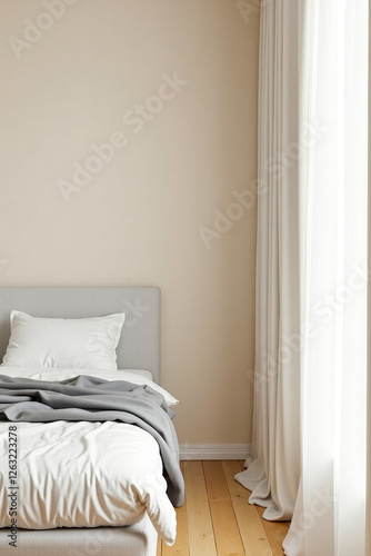 neatly made bed with white linens and gray throw in a serene bedroom