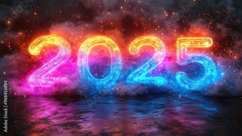 Neon 2025 Number with Smoke and Sparks