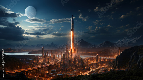 Neon Ascent: Blue Rocket Soaring Through Thermosphere