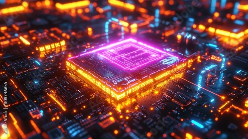 Neon Circuit Lighting. Glowing digital microchip close-up, futuristic technology concept for electronics, IT presentations, innovation themes, vibrant neon circuit board with blue and orange lighting