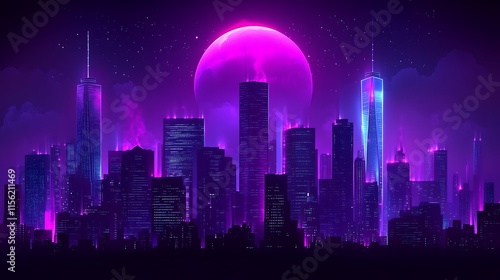 Neon Cityscape Under a Vibrant Purple Moon