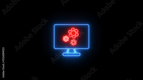 Neon computer screen with gear icons representing settings configuration and system setup on a dark background symbolizing technology and digitalization