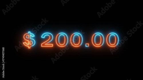 Neon counting dollar number illustration. Glowing 200 dollar sign on black background.