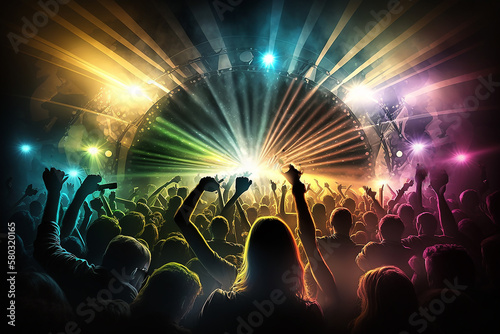 Neon dance party crowd background. Generative IA