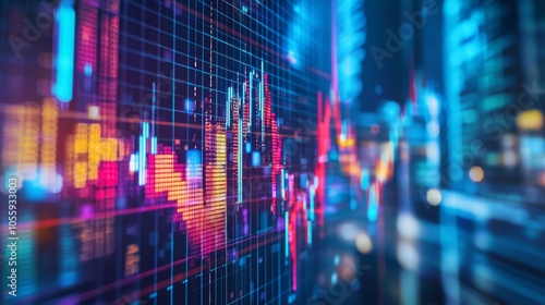Neon digital financial data graph with bright pixels on dark background