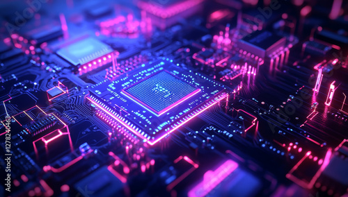 Neon glowing circuit board with vibrant colors and technology