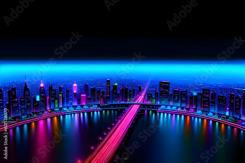 Neon glowing outlined illustration of colorful cityscape panorama