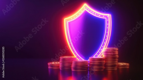 neon icon of a shield securing a pile of coins, representing the protection of assets from financial risks and volatility.