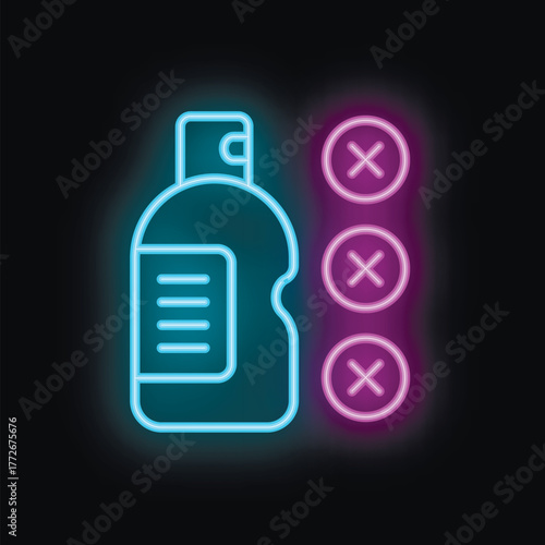 Neon icon of liquid soap or sanitizer and three cross marks showing importance of hand hygiene