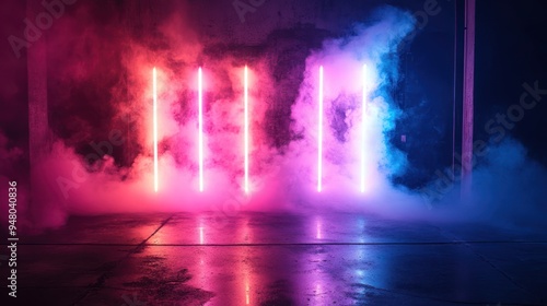 Neon Lights Reflecting on Wet Concrete Floor in a Smokey Room