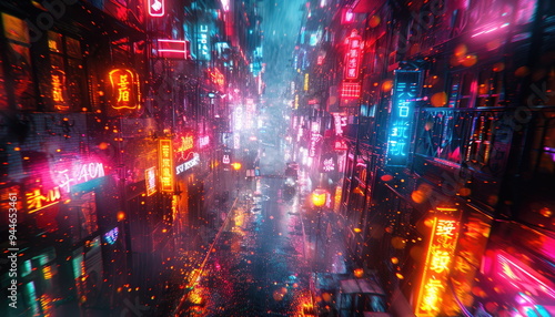Neon Lights Reflecting on Wet Street in Cyberpunk City