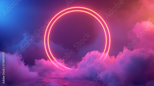 Neon pink circle among the clouds, neon background