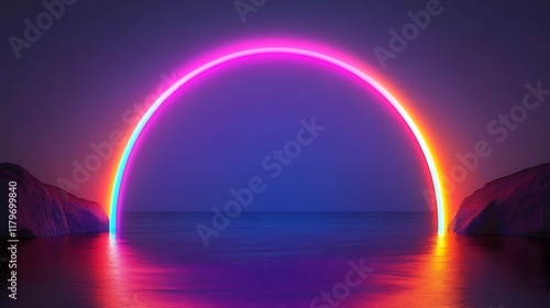Neon Rainbow Arch Over Calm Water Between Rocks